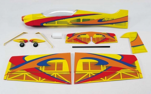Pre-built and covered wings, fuselage and tail assemblies, pushrods,